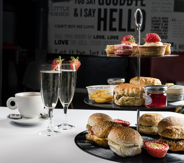 Afternoon Tea set served on a vinyl record stand, complete with sandwiches and Beatles-themed treats